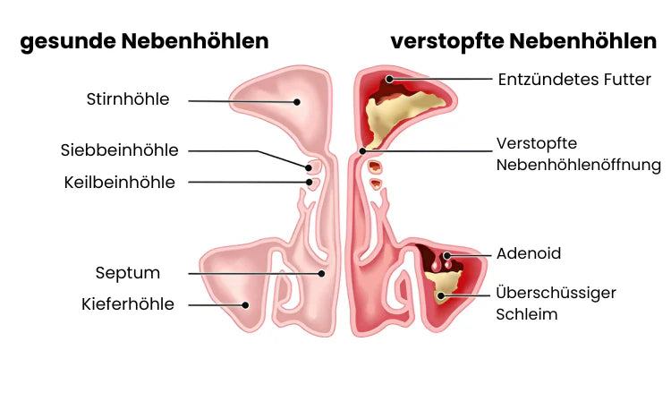 Verstopfte Nebenhöhlen entstehen durch Entzündungen, Schleim und blockierte Öffnungen die Folge sind Druck, Kopfschmerzen und Atemprobleme. Mit moderner Rotlichttherapie kannst du deine Nasenwege sanft befreien.